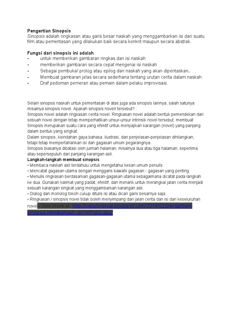 Pengertian, ciri, fungsi dan langkah membuatnya, semoga artikel diatas bisa menambah wawasan kita dan bermanfaat. Alur/plot/jalan cerita sebaiknya disusun secara kronologis dan tepat.alursinopsis sebaiknya sama dengan alur aslinya. Pengertian sinopsis menurut para ahli. Untuk memahami pengertian sinopsis, anda juga harus memahami apa saja jenis dari sinopsis itu. Dalam kamus besar bahasa indonesia (kbbi), sinopsis adalah ringkasan karangan yang biasanya diterbitkan bersama dengan karangan asli yang menjadi dasar sinopsis.